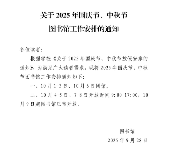 关于 2025年国庆节、中秋节图书馆工作安排的通知